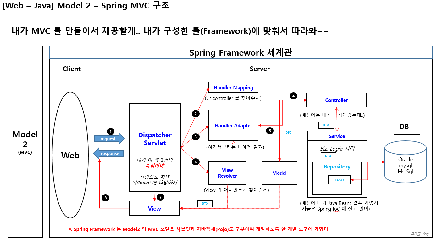 Spring MVC Framework 는 개발 방법론이 아닌 Model2 MVC 에 대한 구체적인 개발 방향성을 제시한다.