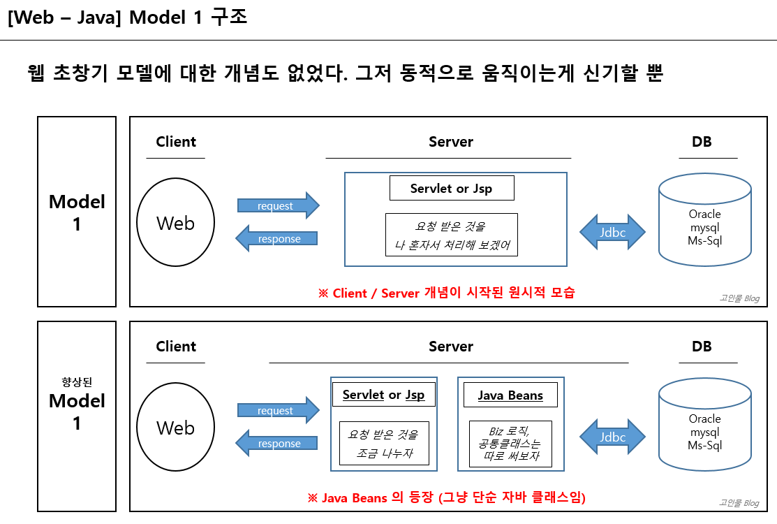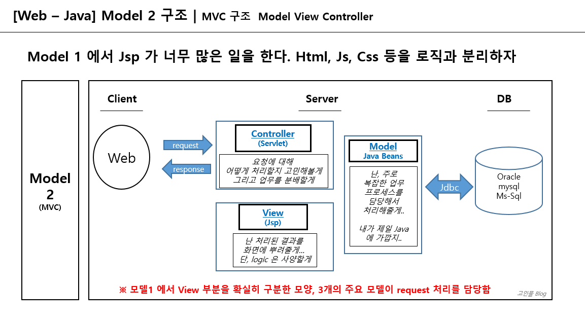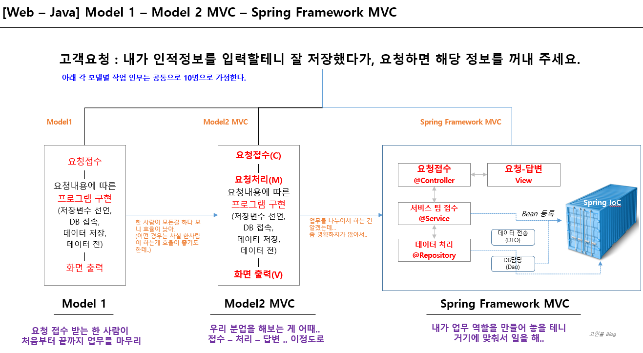 학습목표 : 웹 개발에 사용되는 방법론 Model 1, Model 2, Spring MVC 를 이론적으로 이해한다.