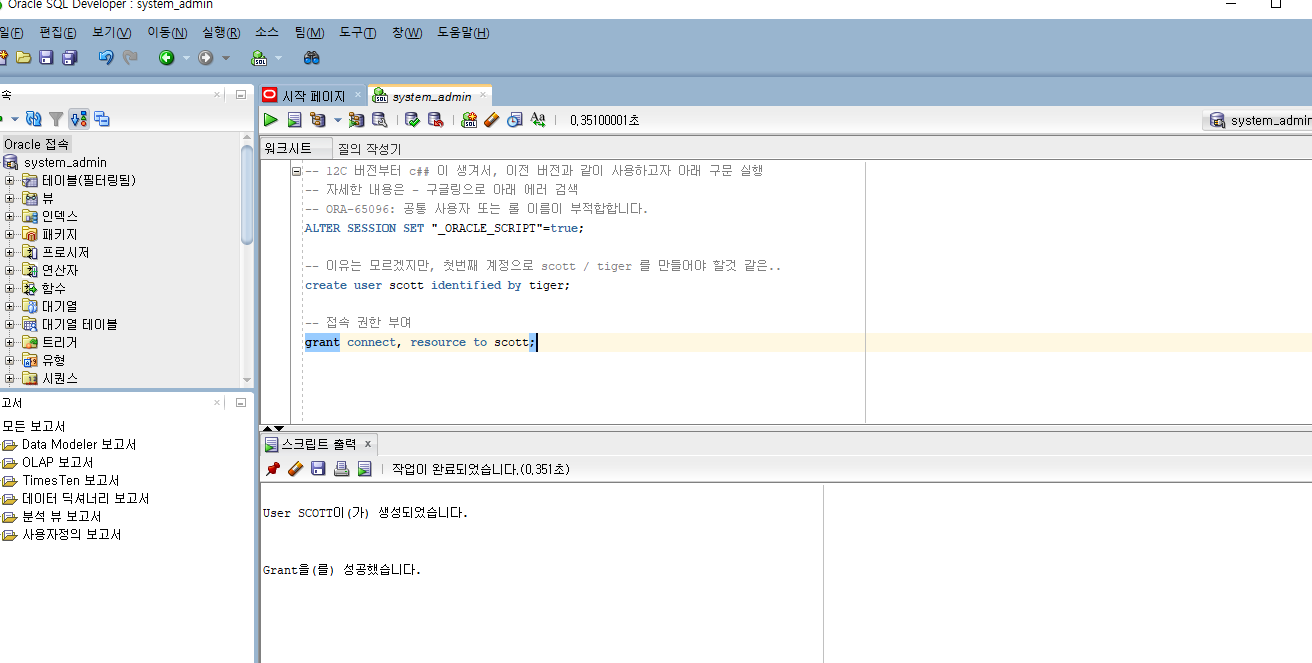 -- 이유는 모르겠지만, 첫번째 계정으로 scott / tiger 를 만들어야 할것 같은..