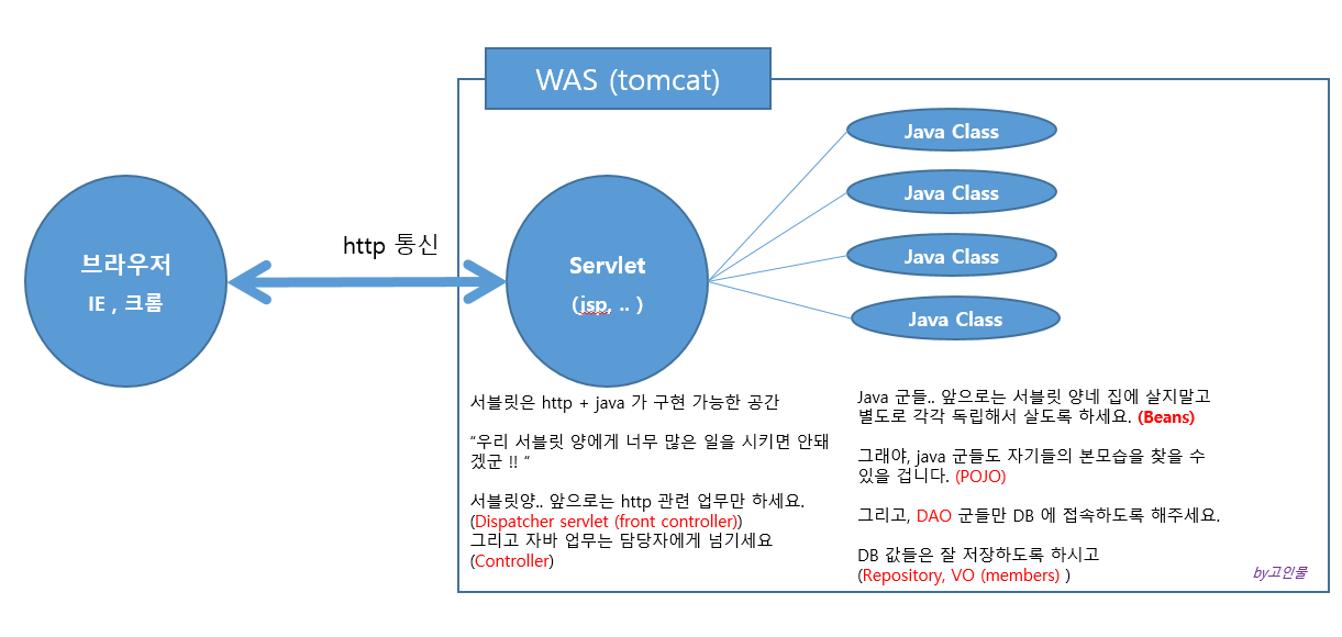 * 브라우저를 통해 들어오는 어떤 내용을 서버(WAS)에서 받아야 한다면, 둘 사이는 약속된 규정을 가지고 통신을 해야 하는데, 이 규약이 HTTP 이다.