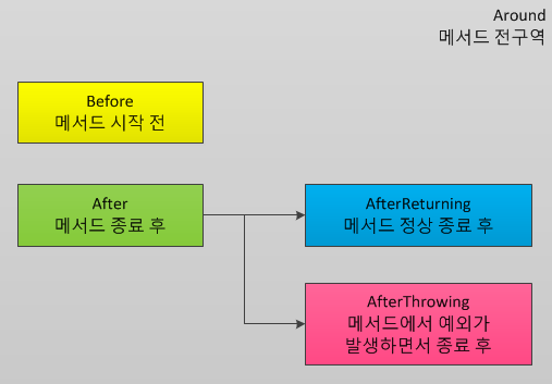 | Around | (메소드 실행 전후) 어드바이스가 타겟 메소드를 감싸서 타겟 메소드 호출전과 후에 어드바이스 기능을 수행 |