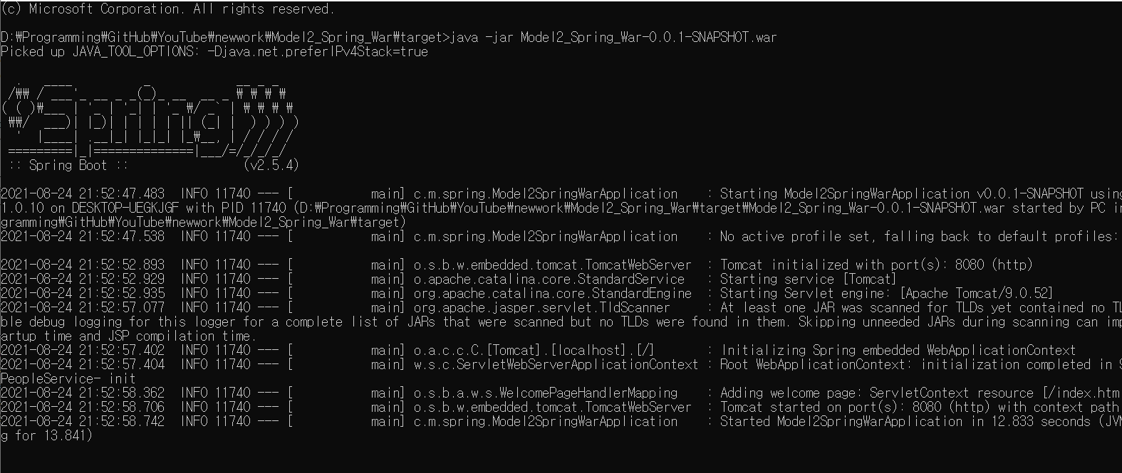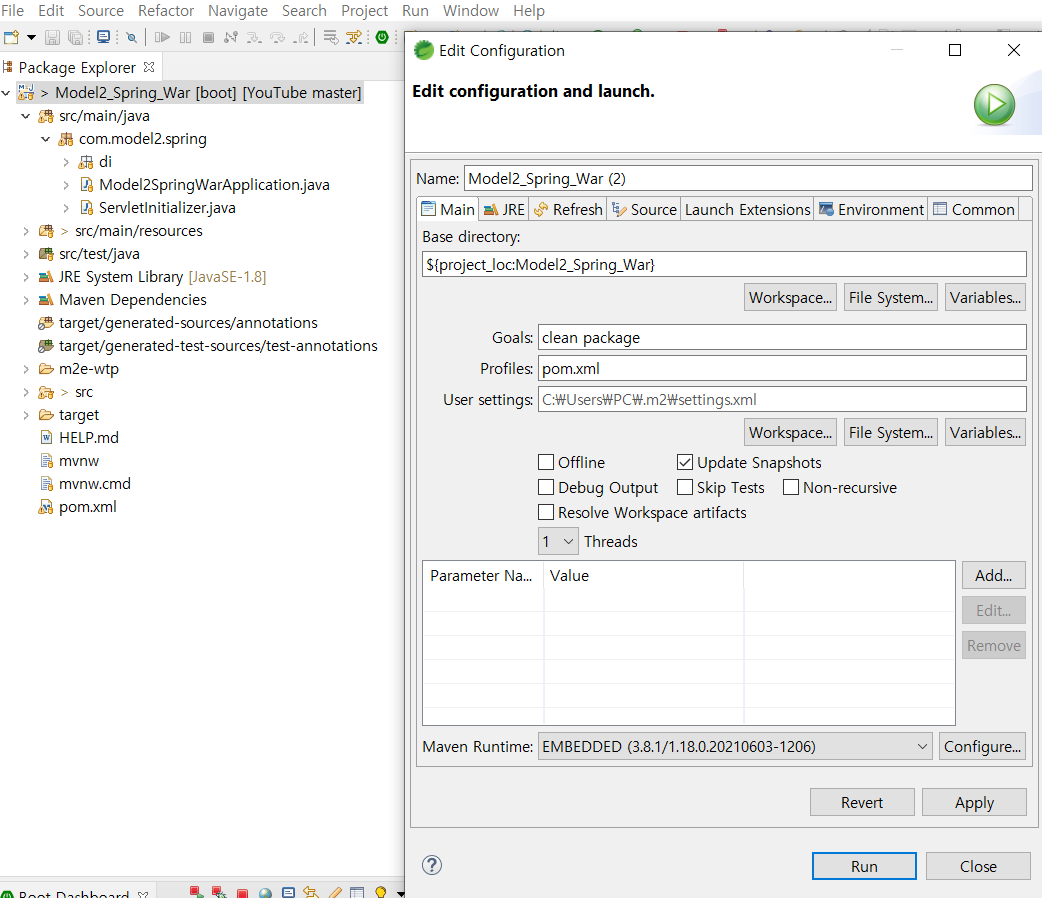 내장톰캣 실행 - java -jar Model2_Spring_War-0.0.1-SNAPSHOT.war