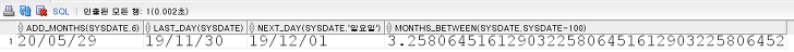 SELECT ADD_MONTHS(SYSDATE,6), --현재시간 + 6개월 뒤 LAST_DAY(SYSDATE), --해당월 마지막 일자 계산 NEXT_DAY(SYSDATE,'일요일'), --다음 주 일요일 계산 MONTHS_BETWEEN(SYSDATE, SYSDATE-100) --DATE1과 DATE2의 개월 수 반환FROM DUAL