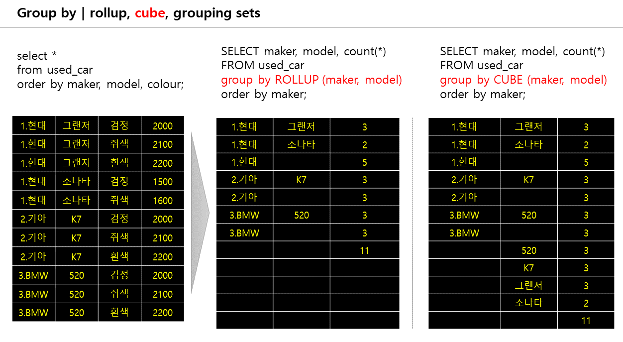 values('1.현대','그랜저','흰색',2200);