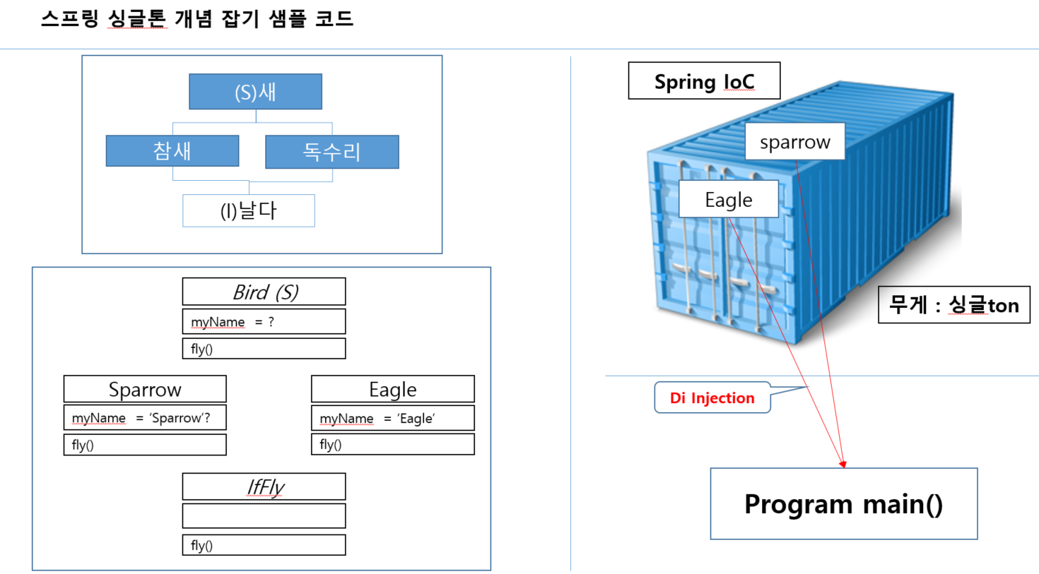 스프링이 모든 의존성 객체를 스프링이 실행될때 다 만들어주고 필요한곳에 주입시켜줌으로써 Bean들은 싱글턴 패턴의 특징을 가지며,