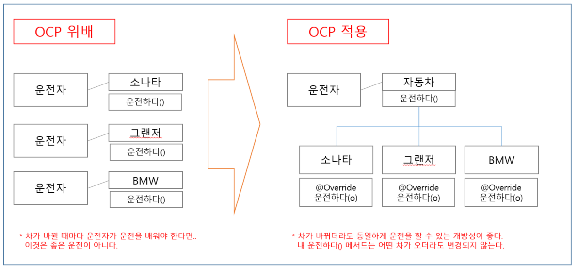 - 소프트웨어 요소는 확장에는 열려 있으나 변경에는 닫혀 있어야 한다.