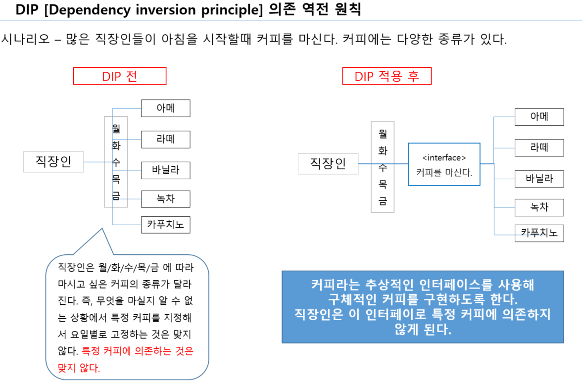학습목표 : 의존관계 역전 원칙 (Dependency inversion principle)을 이해하고, 예제로 설명할 수 있다.