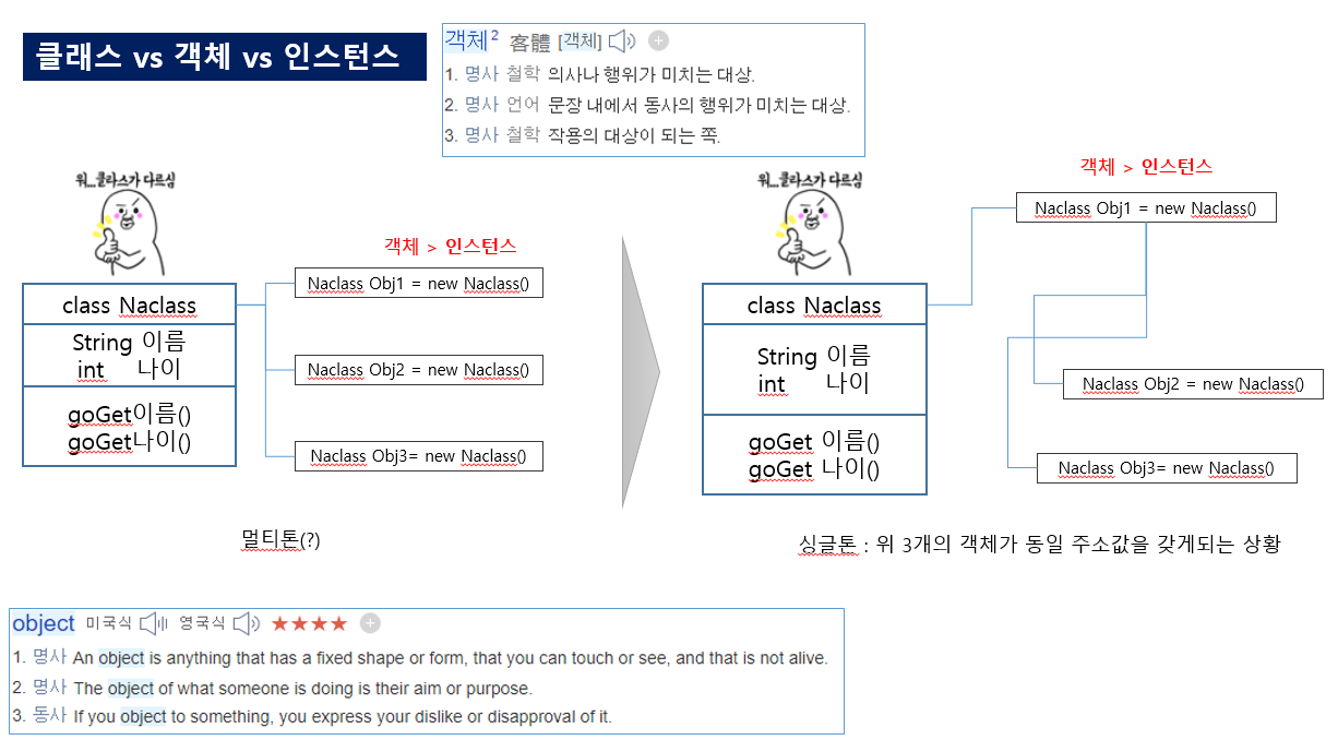 학습목표 : 단어의 뜻을 통해 객체지향의 추상화를 이해한다. 1. 추상화 언어 정의 - 추상 : 추상 1 抽象 : 명사 심리 여러 가지 사물이나 공통되는 특성이나 속성 따위를 추출하여 파악하는 작용. - 추상화 : 추상화 2 抽象畫 [추상화] 명사 미술 사물의 사실적 재현이 아니고 순수한 점ㆍ선ㆍ면ㆍ색채에 의한 표현을 목표로 한 그림. 일반적으로는 대상의 형태를 해체한 입체파 등의 회화도 포함한다. 2. abstraction 영어정의 An abstraction isageneralidearatherthanonerelatingtoaparticularobject,person,orsituation. 3. 자바에서 추상화는 - class 를 통해 지원한다. OOP 의 추상화는 모델링이다. - 자바는 class 를..