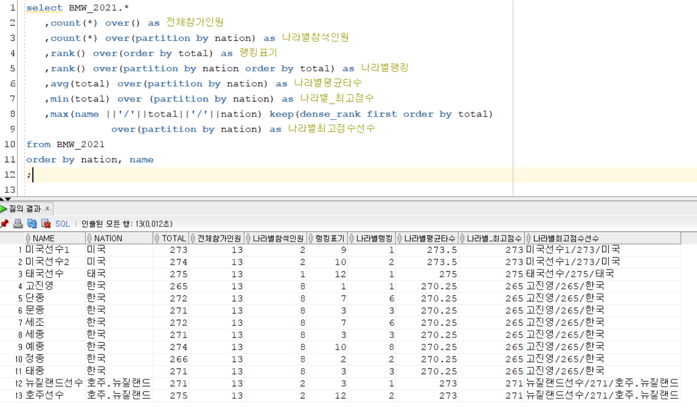 1. 예제 테이블 생성 더보기 create table used_car( maker varchar2(100), -- 제조사 model varchar2(100), -- 모델명 colour varchar2(100), -- 차량색깔 price number -- 가격 ); 2. 예제 데이타 생성 더보기 insert into used_car( maker, model, colour, price ) values('1.현대','그랜저','검정',2000); insert into used_car( maker, model, colour, price ) values('1.현대','그랜저','쥐색',2100); insert into used_car( maker, model, colour, price ) values('1.현대'..