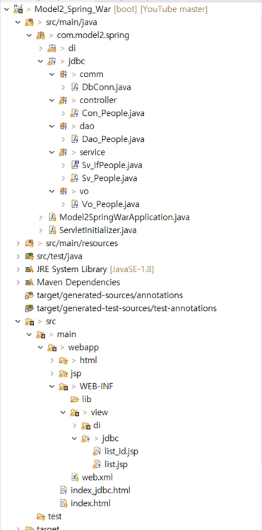 참고, Step 1,2,3 진행 후 , DB 연결부분에 대한 학습입니다. 1. 패키지 구조, 디렉토리 구조 추가 - jdbc 패키지 아래로 controller, service, dao, vo 패키지 추가 - WEB-INF > view > list.jsp , list_id.jsp - webapp > html > regist_jdbc.html 2. 소스코드 - jdbc 패키지 하위 더보기 src/main/java/com/model2/spring/jdbc/comm/DbConn.java package com.model2.spring.jdbc.comm; import java.sql.Connection; import java.sql.DriverManager; public class DbConn { String dr..