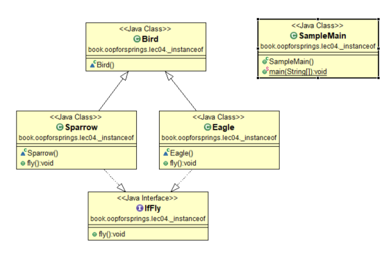 학습목표 : instanceof 의 개념일 이해하고, 예제를 통해 이해할 수 있다. 개념 : 생성된 객체가 어느 클래스에 속해있는지를 확인하는 연산자이다. 특히, Interface 를 통해 객체를 생성할때, 어느 구현체의 것인지 확인 할 때 유용하게 사용 가능하다. SampleMain.java package book.oopforsprings.lec04._instanceof; public class SampleMain { public static void main(String[] args) { Bird bird = new Bird(); Bird eagle = new Eagle(); Sparrow sparrow = new Sparrow(); IfFly ifFly = new Eagle(); // Class T..